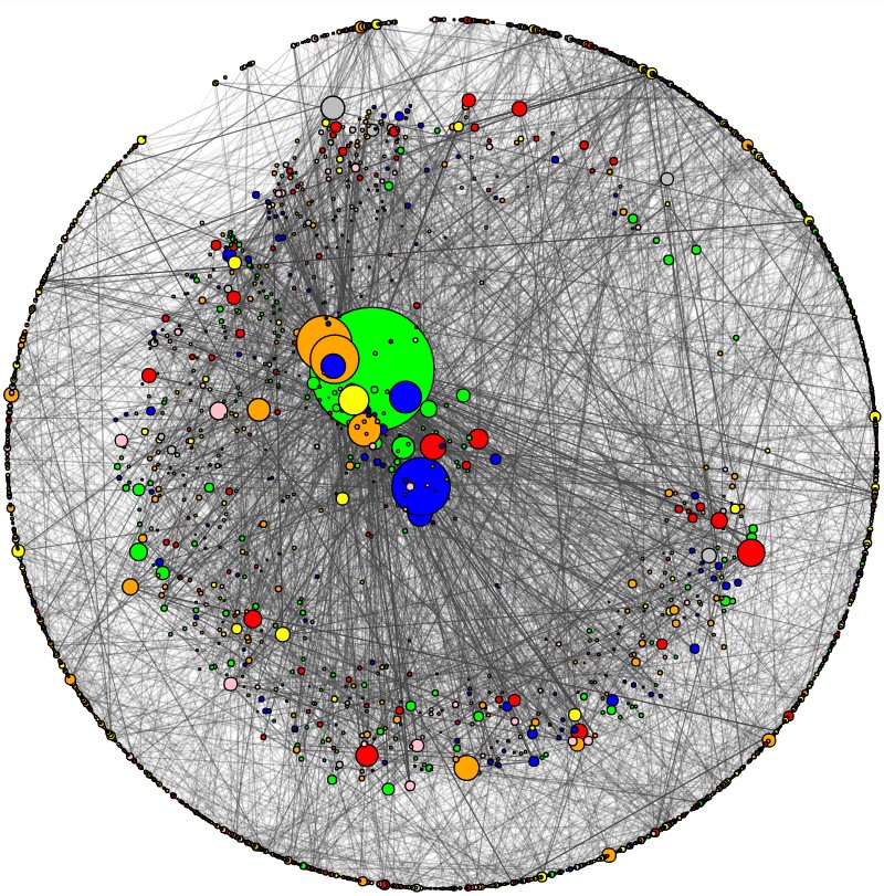 如图,节点大小对应进出边的数量,节点越大表示进出边的数量越多,边的粗细反映对应两节点之间的相似或关联程度越高,也就是对彼此的影响力权重越大。