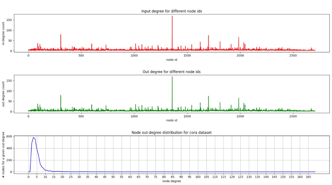 由于cora数据集处理的是无向图,所以'in degree count'与'out degree count'分布图一致,底部的'nodes for a given out-degree'与'node degree'图统计的是数据集中出边的分布情况,可以看到峰值点出现在[2, 4]范围内,说明大多数的节点之间之间与少量的边进行相连,相连节点最多的边是图中绿色节点,约有169个节点相连。