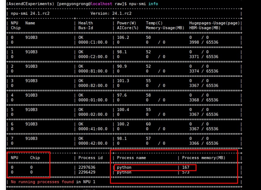 内存使用情况: 整个训练过程的内存使用情况可以通过"npu-smi info"命令在终端查看,因此本文实验只用到了单个npu卡(也就是chip 0),内存占用约167M,对内存、精度或性能优化有兴趣的可以自行尝试进行优化,这里运行过程中也有其他程序在运行,因此本实验用到的网络所需要的内存已单独框出来。