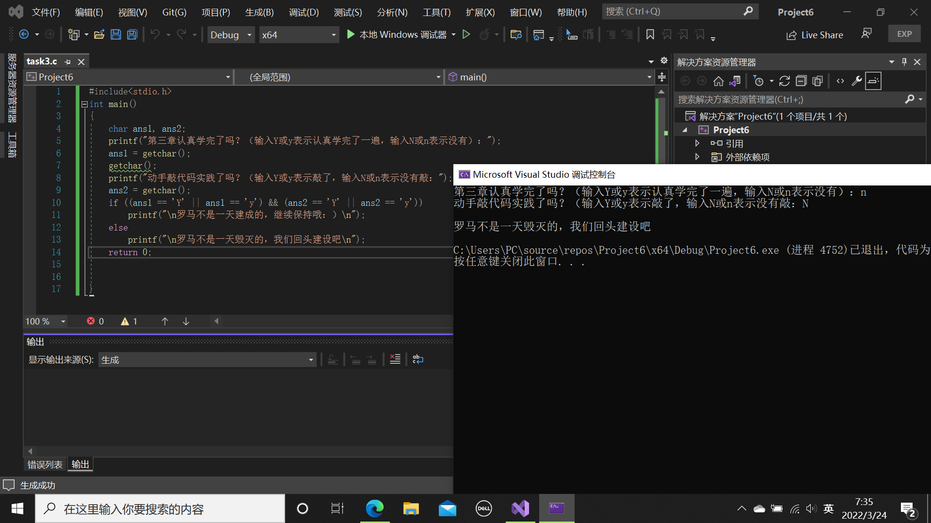 #include<stdio.h> int main() { char ans1, ans2; printf("第三章认真学完了吗?(输入Y或y表示认真学完了一遍,输入N或n表示没有):"); ans1 = getchar(); getchar(); printf("动手敲代码实践了吗?(输入Y或y表示敲了,输入N或n表示没有敲:"); ans2 = getchar(); if ((ans1 == 'Y' || ans1 == 'y') && (ans2 == 'Y' || ans2 == 'y')) printf("\n罗马不是一天建成的,继续保持哦:)\n"); else printf("\n罗马不是一天毁灭的,我们回头建设吧\n"); return 0; }