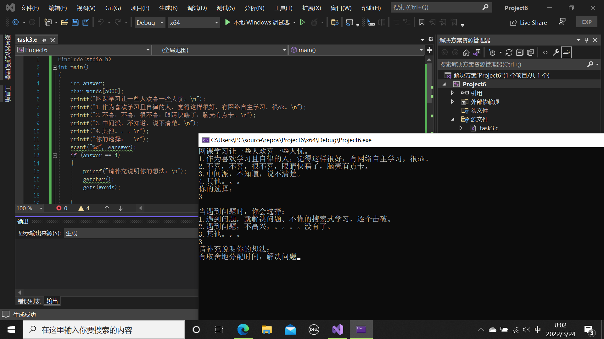 #include<stdio.h> int main() { int answer; char words[5000]; printf("网课学习让一些人欢喜一些人忧。\n"); printf("1.作为喜欢学习且自律的人,觉得这样很好,有网络自主学习,很ok。\n"); printf("2.不喜,不喜,很不喜,眼睛快瞎了,脑壳有点卡。\n"); printf("3.中间派,不知道,说不清楚。\n"); printf("4.其他。。。\n"); printf("你的选择: \n"); scanf("%d", &answer); if (answer == 4) { printf("请补充说明你的想法:\n"); getchar(); gets(words); } printf("\n"); printf("当遇到问题时,你会选择:\n"); printf("1.遇到问题,就解决问题。不懂的搜索式学习,逐个击破。\n"); printf("2.遇到问题,不高兴,。。。。没有了。\n"); printf("3.其他。。。\n"); scanf("%d", &answer); if (answer == 1) printf(":)\n"); else if (answer == 2) printf("这样不能解决问题啊,我们选择1好不好:)\n"); else if (answer == 3) { printf("请补充说明你的想法:\n"); getchar(); gets(words); } return 0;