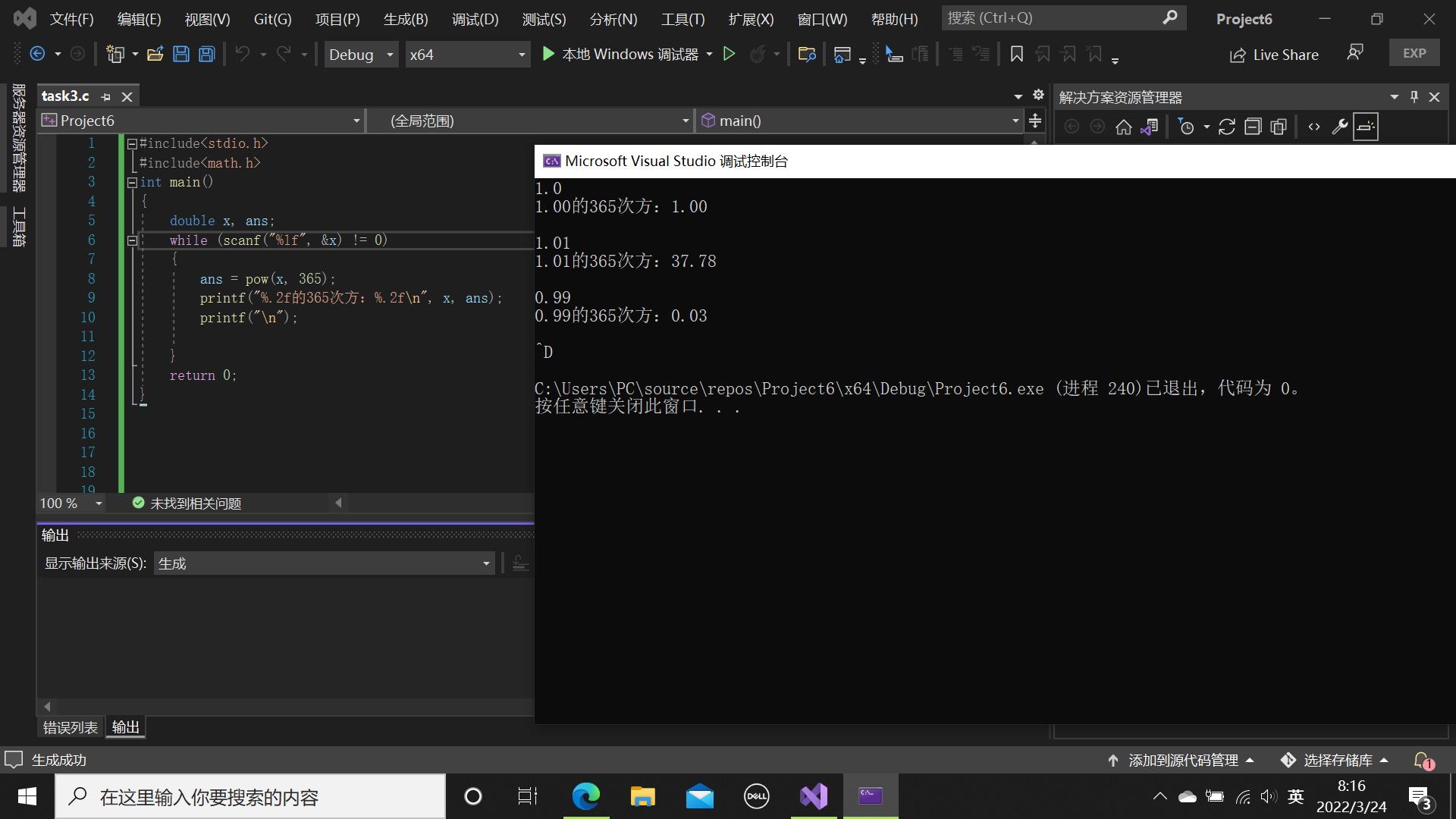 #include<stdio.h> #include<math.h> int main() { double x, ans; while (scanf("%lf", &x) != 0) { ans = pow(x, 365); printf("%.2f的365次方:%.2f\n", x, ans); printf("\n"); } return 0; }