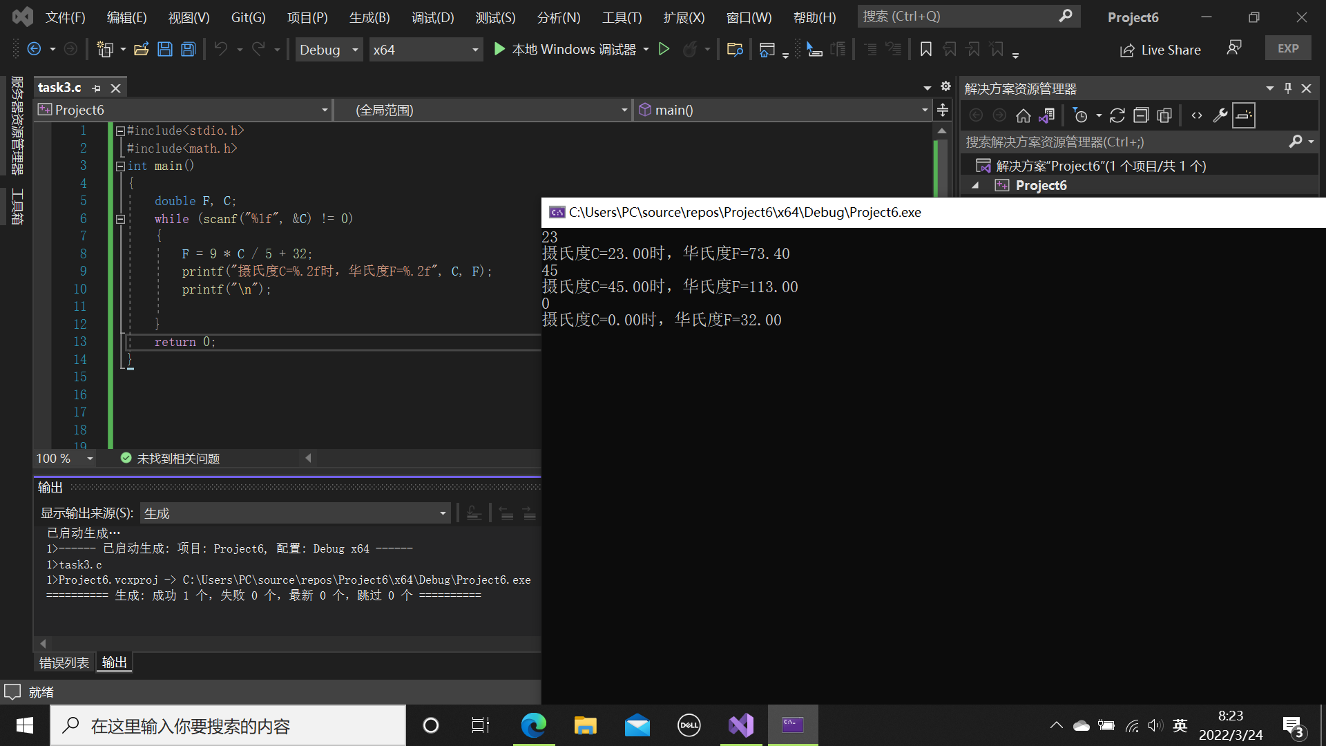 #include<stdio.h> #include<math.h> int main() { double F, C; while (scanf("%lf", &C) != 0) { F = 9 * C / 5 + 32; printf("摄氏度C=%.2f时,华氏度F=%.2f", C, F); printf("\n"); } return 0; }