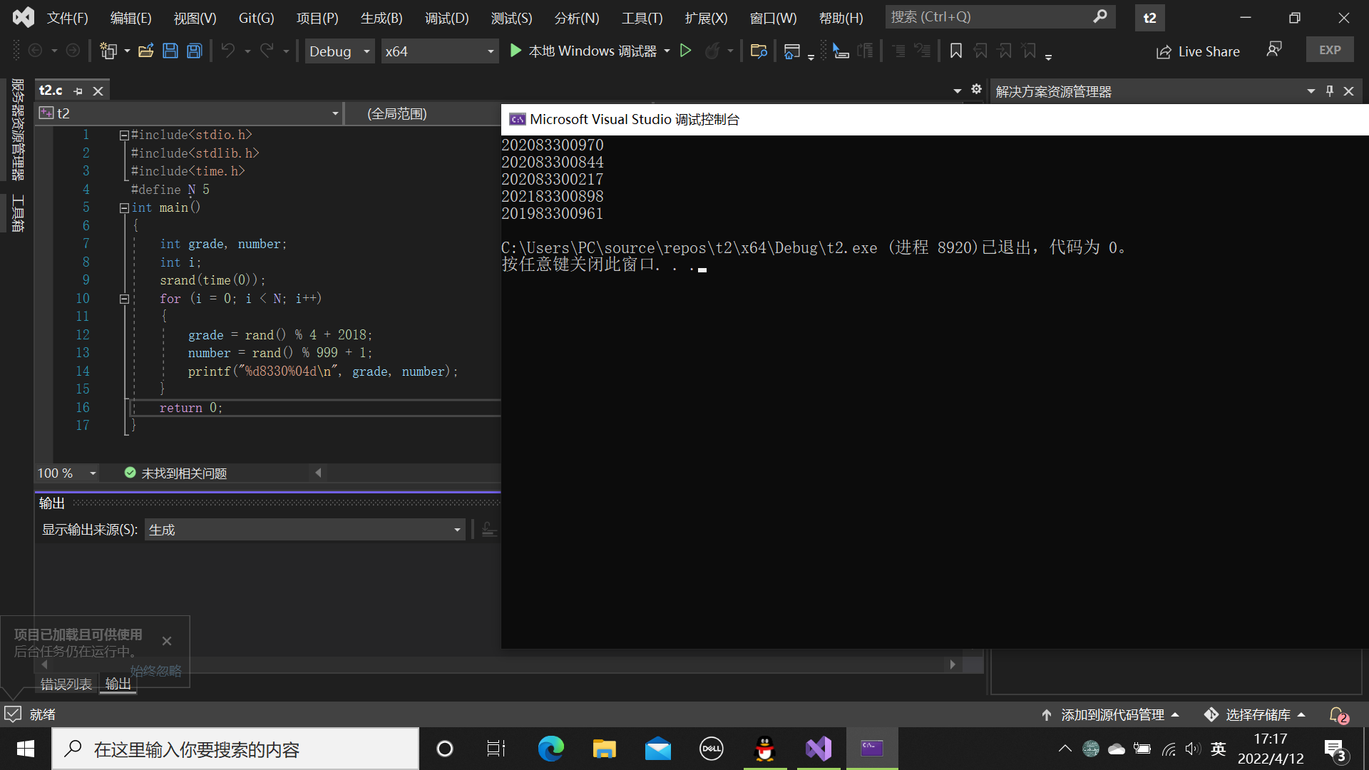 #define _CRT_SECURE_NO_WARNINGS #include<stdio.h> #include<time.h> #define N 5 int main() { int grade, number; int i; srand(time(0)); for (i = 0; i < N; ++i) { grade = rand() % 4 + 2018; number = rand() % 999 + 1; printf("%d8330%04d\n", grade, number); } return 0; }