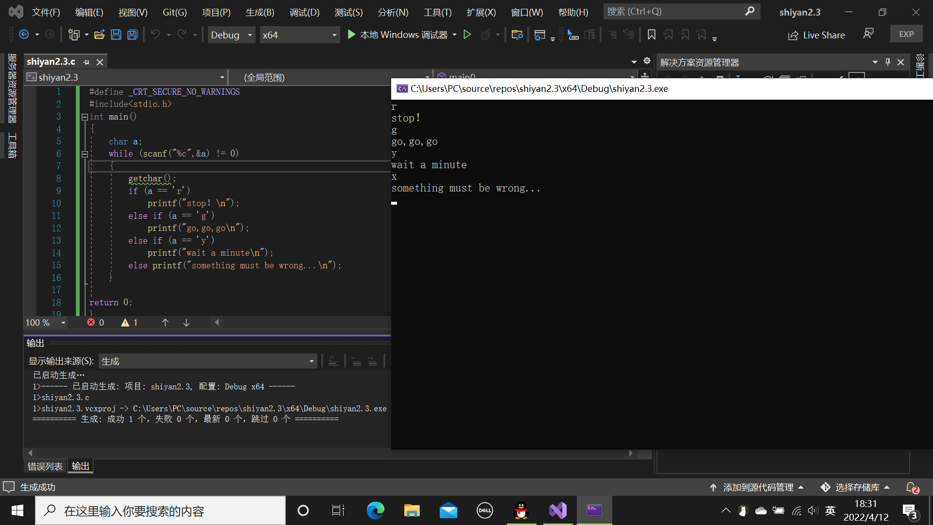 #define _CRT_SECURE_NO_WARNINGS #include<stdio.h> int main() { char a; while (scanf("%c",&a) != 0) { getchar(); if (a == 'r') printf("stop!\n"); else if (a == 'g') printf("go,go,go\n"); else if (a == 'y') printf("wait a minute\n"); else printf("something must be wrong...\n"); } return 0; }