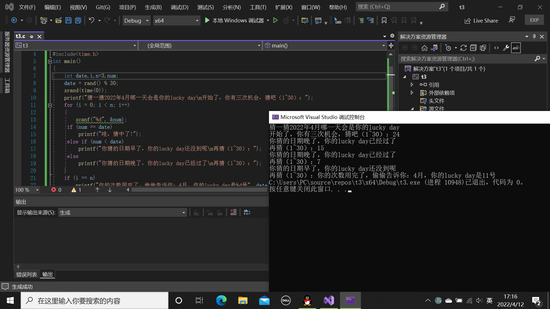 #define _CRT_SECURE_NO_WARNINGS #include<stdio.h> #include<time.h> int main() { int date, i, n = 3, num; date = rand() % 30; srand(time(0)); printf("猜一猜2022年4月哪一天是你的lucky day\n开始了,你有三次机会,猜吧(1~30):"); for (i = 0; i < n; i++) { scanf("%d", &num); if (num == date) printf("哇!猜中了!"); else if (num < date) printf("你猜的日期早了,你的lucky day还没到呢\n再猜(1~30):"); else printf("你猜的日期晚了,你的lucky day已经过了\n再猜(1~30):"); } if (i == n) printf("你的次数用完了,偷偷告诉你,4月,你的lucky day是%d号", date); return 0; }
