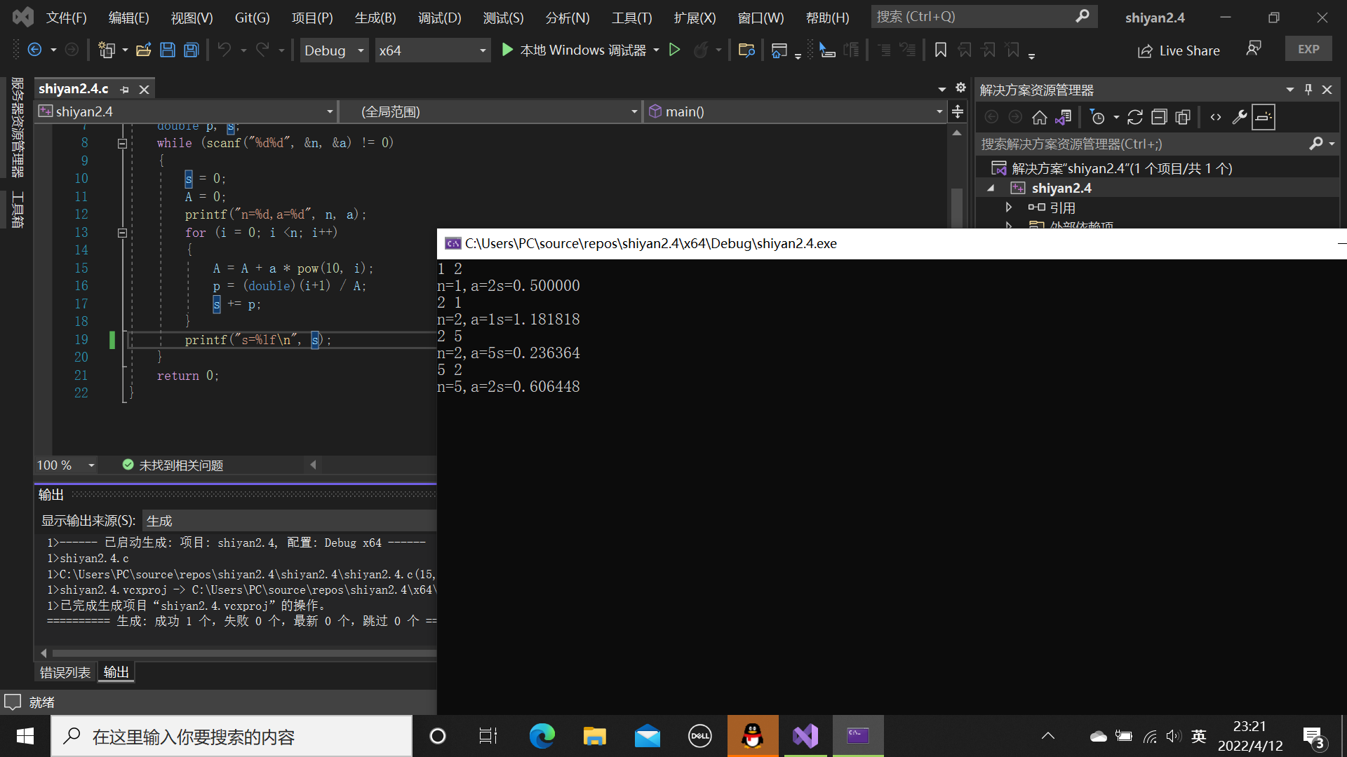 #define _CRT_SECURE_NO_WARNINGS #include<stdio.h> #include<math.h> int main() { int n, a, i, A ; double p, s; while (scanf("%d%d", &n, &a) != 0) { s = 0; A = 0; printf("n=%d,a=%d", n, a); for (i = 0; i <n; i++) { A = A + a * pow(10, i); p = (double)(i+1) / A; s += p; } printf("s=%lf\n", s); } return 0; }