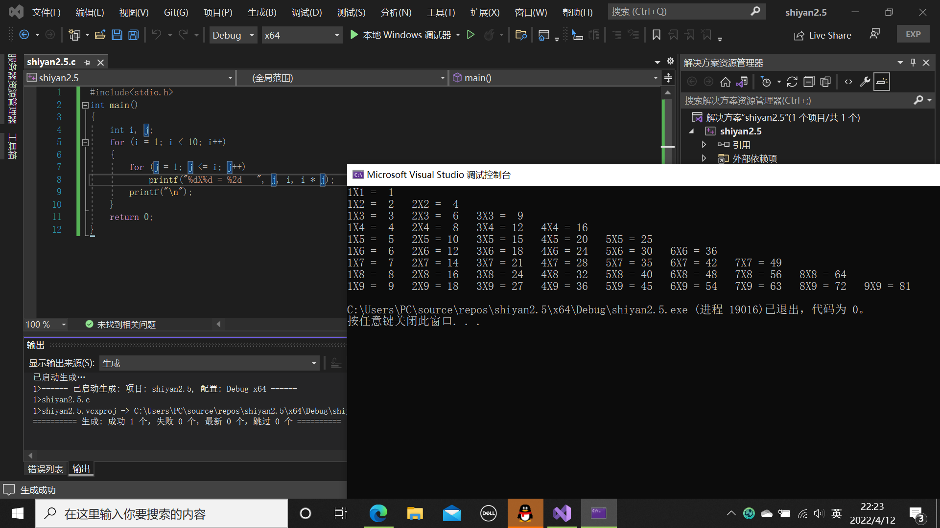 #include<stdio.h> int main() { int i, j; for (i = 1; i < 10; i++) { for (j = 1; j <= i; j++) printf("%dX%d = %2d ", j, i, i * j); printf("\n"); } return 0; }