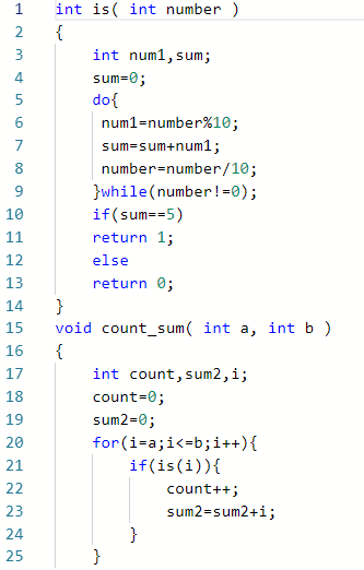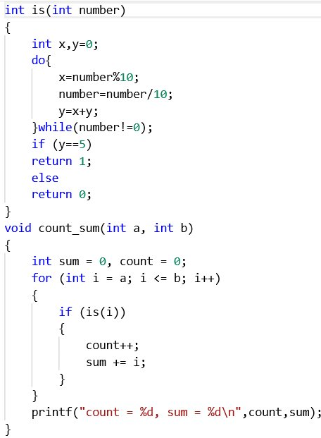 本题要求实现两个函数:一个函数判断给定正整数的各位数字之和是否等于5;另一个函数统计给定区间内有多少个满足上述要求的整数,并计算这些整数的和。