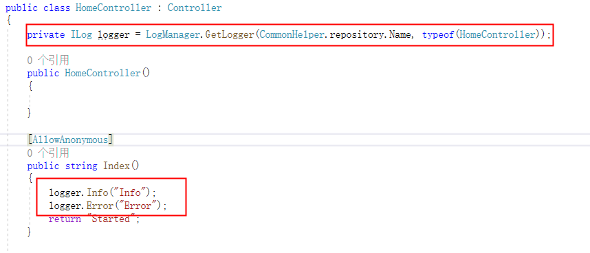 controller层:private ILog logger = LogManager.GetLogger(CommonHelper.repository.Name, typeof(HomeController));