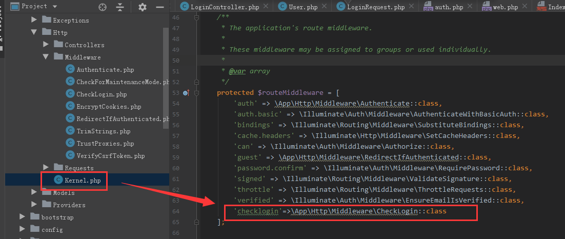 4,注册路由中间件 App\Http\Requests\Kernel.php