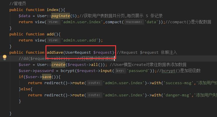 3,App\Http\Controllers\Admin\UserController.php 的 indexSave() 方法里的第一个参数 Request 改成 UserRequest 【即 接收新增用户的数据时引用了 UserRequest.php上的校验方法】如下图示