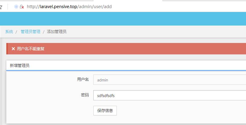 测试 验证的效果,浏览器访问 http://laravel.pensive.top/admin/user/add 然后新增一个已存在的用户名admin 后提交会 有提示 用户名不能重复 如下图示