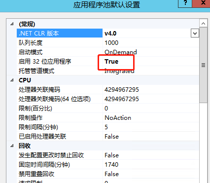 网站程序池->右侧栏选择 设置应用程序池默认设置->常规下的第4项:启用32位应用程序->设置为 TRUE