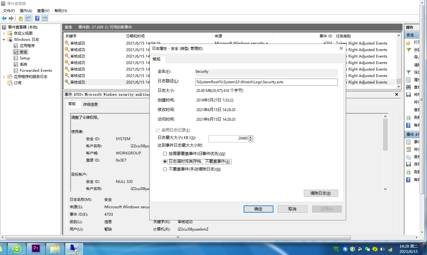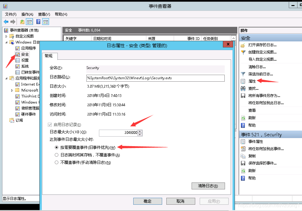 解决办法:把“C:\Windows\System32\winevt\Logs”文件夹中Archive-Security开头的存档文件按需删除,然后安全日志设置为“按需要覆盖事件(旧事件优先)”