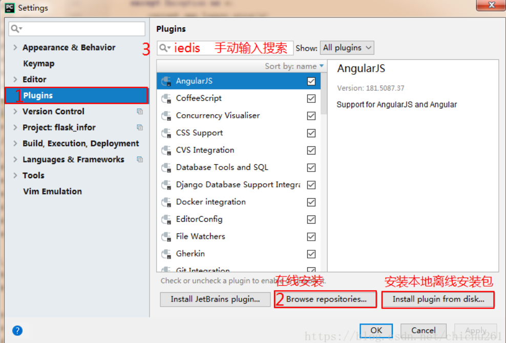 File —> Settings —>Plugins (默认快捷键: Ctrl + Alt + S)