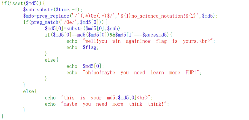第二条if语句则与上一条语句相斥:只有在md5数组中匹配到0e才能继续执行