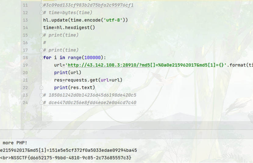 需要让md5数组的第二个元素的值与guessmd5一致并且这里是强等于,我们可以先取一个大于当前时间戳的值赋给md5数组的第二个对象,运行等到二者相等即可