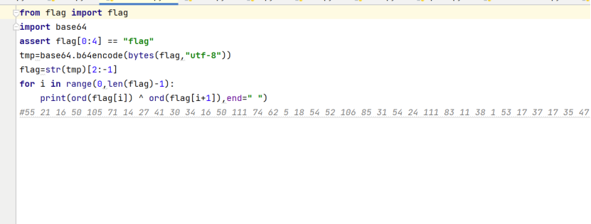 看代码,如果flag变量的前4位为”flag”则进行下面的操作,将byte类型的flag进行base64编码,并将一次编码后的密文数据类型转换为string型,接着对一次编码后的密文进行异或操作,规则是每一位与后一位异或