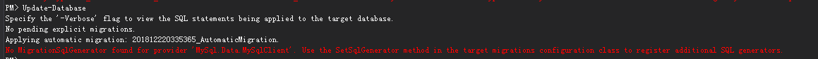 No MigrationSqlGenerator found for provider 'MySql.Data.MySqlClient'. Use the SetSqlGenerator method in the target migrations configuration class to register additional SQL generators.