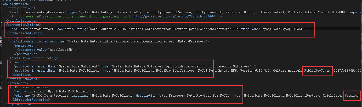 - 配置文件应包含configSections、providers、DbProviderFactories三个节点,且Version和PublicKeyToken应保持一致。