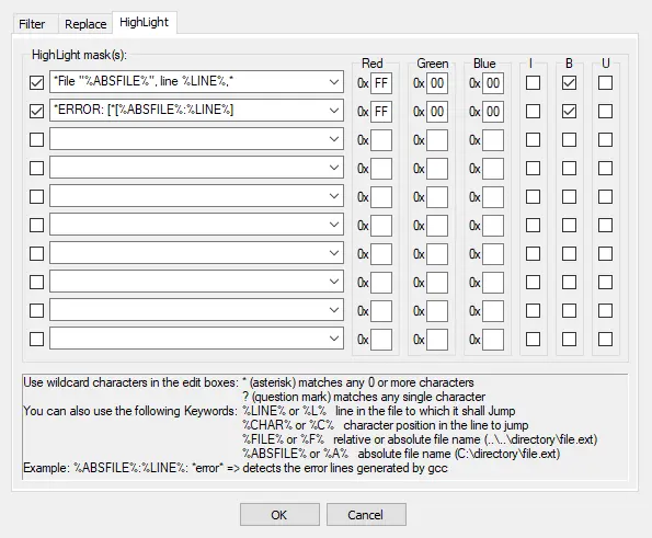 其中,第一条为python的错误提示格式,第二条对应verilog的错误提示,%ABSFILE%对应当前文件的绝对路径,%LINE%对应要跳转的行。对于不同的语言错误的错误提示需要根据实际情况进行匹配。