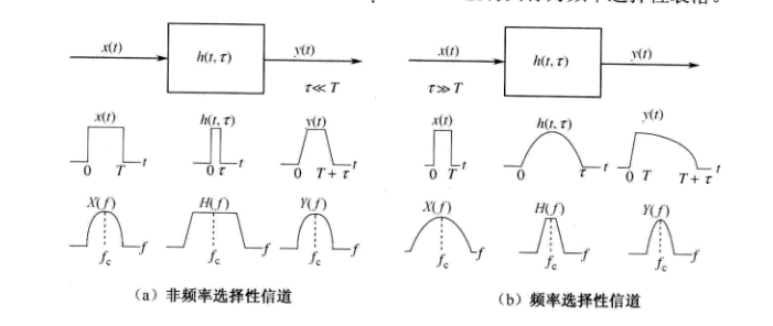 时间色散效应:引起频率选择性衰落信道,相干带宽与信号带宽之间的关系确定频率选择性衰落还是平坦衰落。