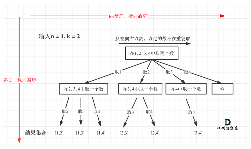 path.pop_back();//当前叶子节点已被保存,回退到上一层的for循环遍历,故需要撤销元素,使之返回到上一层,例如当n=4,k=2时,[1, 2]这个叶子节点被保存,此时删除2,是为了保存下一个叶子节点即[1,3]