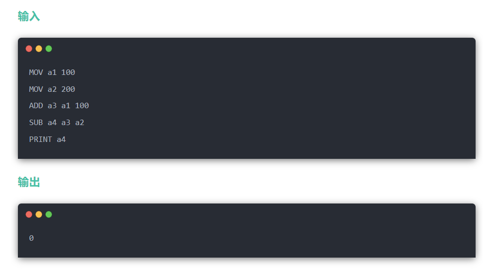 输出:对输入的每行指令,若为PRINT指令,则输出打印一行,该行中包括一个整数,表示寄存器的值