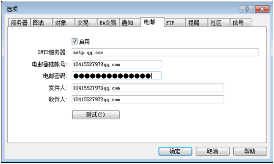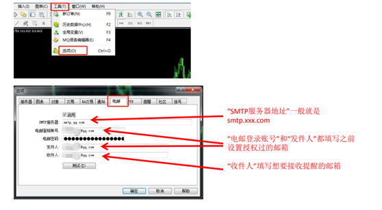 MT4启用电邮设置邮件提醒就是让指标或者EA始终在监控特定的交易信号或者账户持仓状态等,当被监控的交易信号或持仓状态满足某种设定的条件时,MT4就会通过内置的邮件发送功能发送电子邮件到指定的邮箱以提醒账户持有人或交易者即时对这些信号或持仓状态做出处理。
