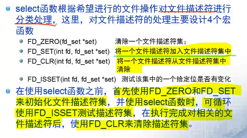 FD_SET(fd,set);//将描述符加到set里