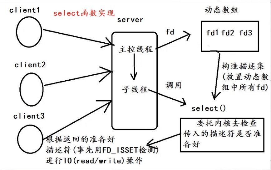 *启动的子线程负责调用select()函数委托内核检查传入到select中的描述符是否准备好,利用FD_ISSET找出准备好的描述符,和对应的客户端进行通信