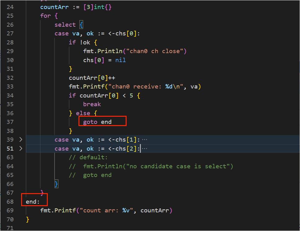 - 一条select语句中只能够有一个默认分支。并且,默认分支只在无候选分支可选时才会被执行,这与它的编写位置无关。