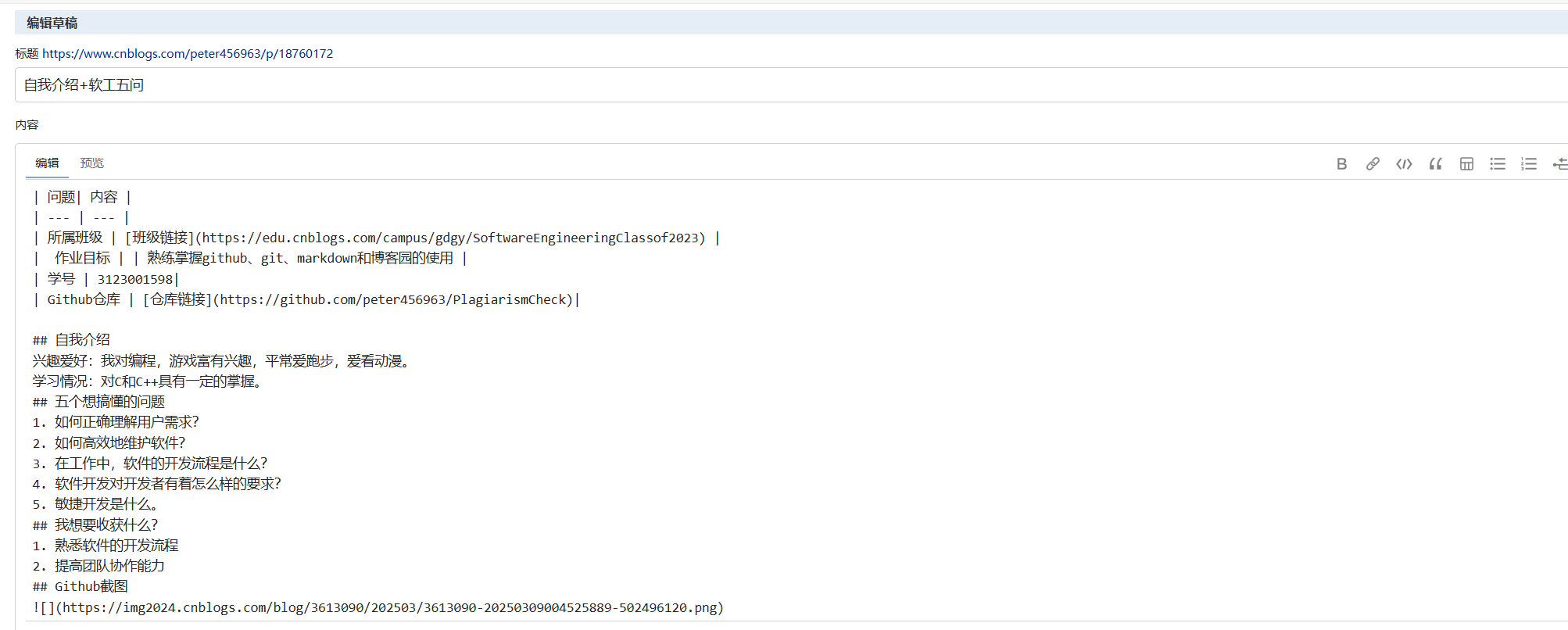 | 作业目标 | 熟练掌握github、git、markdown和博客园的使用 |