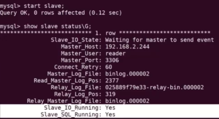 从节点执行上图所示命令,从主节点读取binlog日志,根据日志,与主节点保持一致。