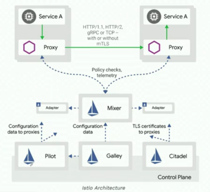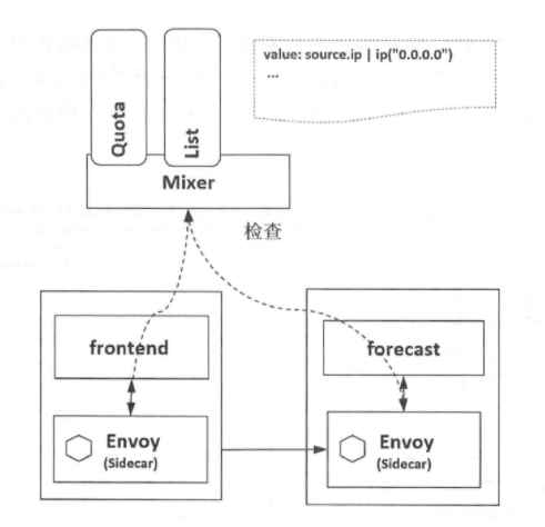 如图下图所示,数据面在转发服务的请求前调用istio-policy 的Check接口检查是否允许访问, Mixer 根据配置将请求转发到对应的Adapter 做对应检查,给代理返回允许访问还是拒绝。可以对接如配额、授权、黑白名单等不同的控制后端,对服务间的访问进行可扩展的控制。