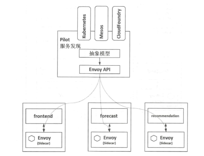 如下图所示:pilot直接从运行平台(kubernetes,consul)提取数据并将其构造和转换成istio的服务发现模型, 因此pilot只有服务发现功能,无须进行服务注册。这种抽象模型解耦Pilot 和底层平台的不同实现,可支持kubernetes,consul等平台