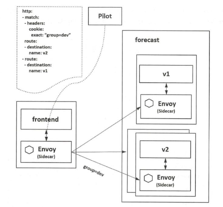 除了服务发现, Pilot 更重要的一个功能是向数据面下发规则,包括VirtualService 、DestinationRule 、Gateway 、ServiceEntry 等流量治理规则,也包括认证授权等安全规则。Pilot 负责将各种规则转换成Envoy 可识别的格式,通过标准的XDS 协议发送给Envoy,指导Envoy 完成功作。在通信上, Envoy 通过gRPC 流式订阅Pilot 的配置资源。如下图所示, Pilot 将VirtualService 表达的路由规则分发到Evnoy 上, Envoy 根据该路由规则进行流量转发。