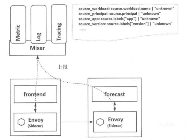 istio-telemetry是专门用于收集遥测数据的Mixer服务组件;如下图所示 所示,当网格中的两个服务间有调用发生时,服务的代理Envoy 就会上报遥测数据给istio-telemetry服务组件,istio-telemetry 服务组件则根据配置将生成访问Metric等数据分发给后端的遥测服务。数据面代理通过Report 接口上报数据时访问数据会被批