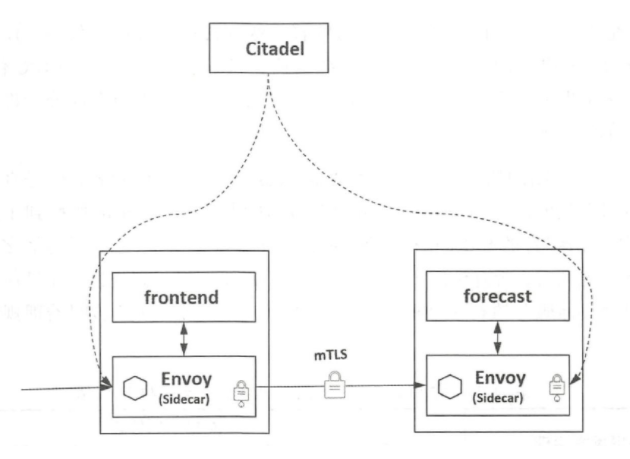 服务列表中的istio-citadel 是Istio 的核心安全组件,提供了自动生成、分发、轮换与撤销密钥和证书功能。Citadel 一直监听Kube-apiserver ,以Secret 的形式为每个服务都生成证书密钥,并在Pod 创建时挂载到Pod 上,代理容器使用这些文件来做服务身份认证,进而代理两端服务实现双向TLS认证、通道加密、访问授权等安全功能,这样用户就不用在代码里面维护证书密钥了。如下图 所示,frontend 服务对forecast 服务的访问用到了HTTP 方式,通过配置即可对服务增加认证功能, 双方的Envoy 会建立双向认证的TLS 通道,从而在服务间启用双向认证的HTTPS 。