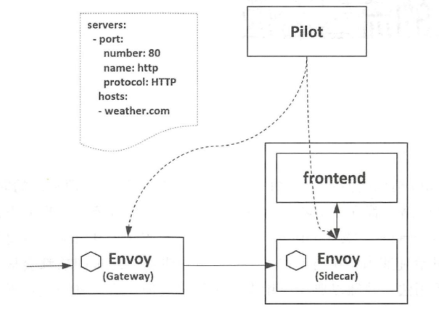 istio-ingressgateway 就是入口处的Gateway ,从网格外访问网格内的服务就是通过这个Gateway 进行的。istio-ingressgateway 比较特别, 是一个Loadbalancer 类型的Service,不同于其他服务组件只有一两个端口,istio-ingressgateway 开放了一组端口,这些就是网格内服务的外部访问端口.如下图 所示,网格入口网关istio-ingressgateway 的负载和网格内的Sidecar 是同样的执行体,也和网格内的其他Sidecar 一样从Pilot处接收流量规则并执行。 。Istio 通过一个特有的资源对象Gateway 来配置对外的协议、端口等。
