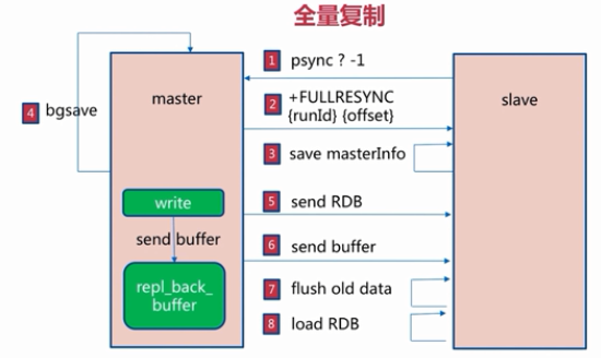 1.在slave第一次向master同步数据时,不知道master的run_id和offset,使用`psync ? -1`命令向master发起同步请求 2.master接受请求后,知道slave是做全量复制,master就会把run_id和offset响应给slave 3.slave保存master发送过来的run_id和offset 4.master响应slave后,执行BGSAVE命令把当前所有数据生成RDB文件,然后将RDB文件同步给slave 5.Redis中的repl_back_buffer复制缓冲区可以记录生成RDB文件之后到同步完成这个时间段时写入的数据,然后把这些数据也同步给slave 6.slave执行flushall命令清空slave中原有的数据,然后从RDB文件读取所有的数据,保证slave与master中数据的同步