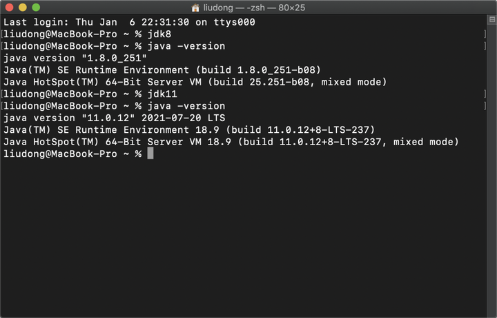 到此在终端输入jdk8或者jdk11就会切换版本了,输入java -version即可查看!