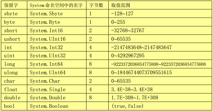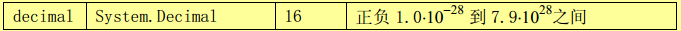 简单类型包括:数值类型和布尔类型(bool)。数值类型又细分为:整数类型,字符类型(char),浮点数类型和十进制类型(decimal),见下表: