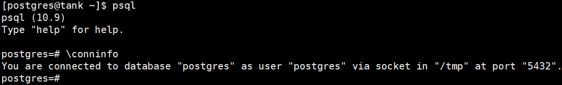 $ psql psql (10.9) Type "help" for help. postgres=# \?