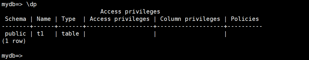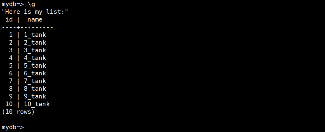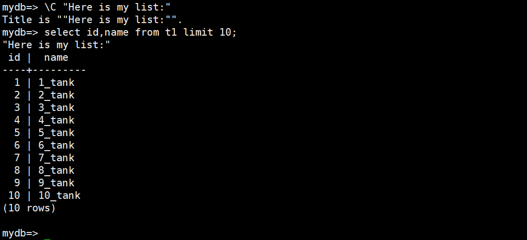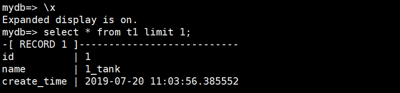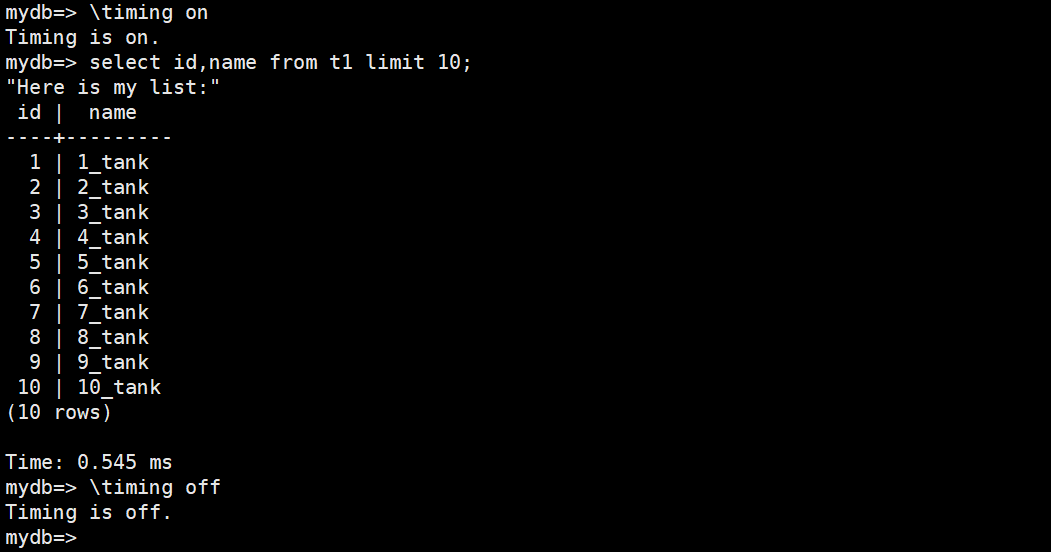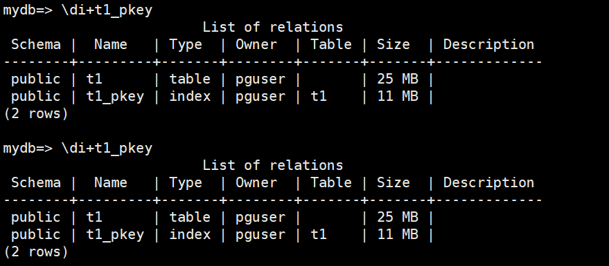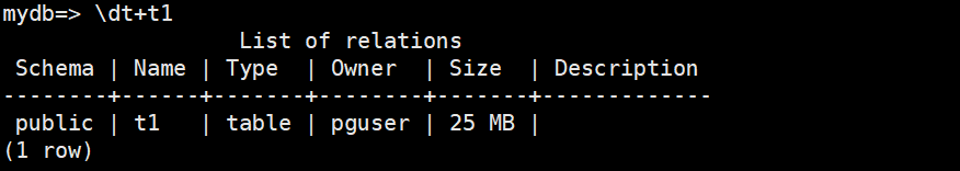 --为测试表插入50万条数据 $ psql mydb pguser mydb=> insert into t1(id,name) select n,n || '_tank' from generate_series(1,500000) n; INSERT 0 500000 mydb=> \dt+t1