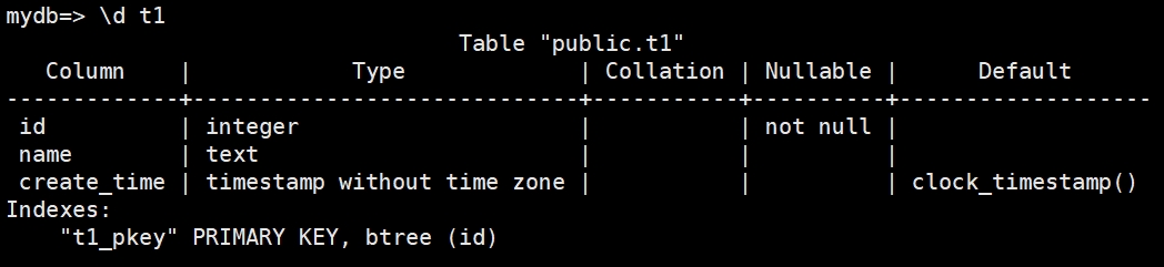 --创建测试表 $ psql mydb pguser mydb=> create table t1(id int4,name text,create_time timestamp without time zone default clock_timestamp()); CREATE TABLE mydb=> alter table t1 add primary key(id); ALTER TABLE