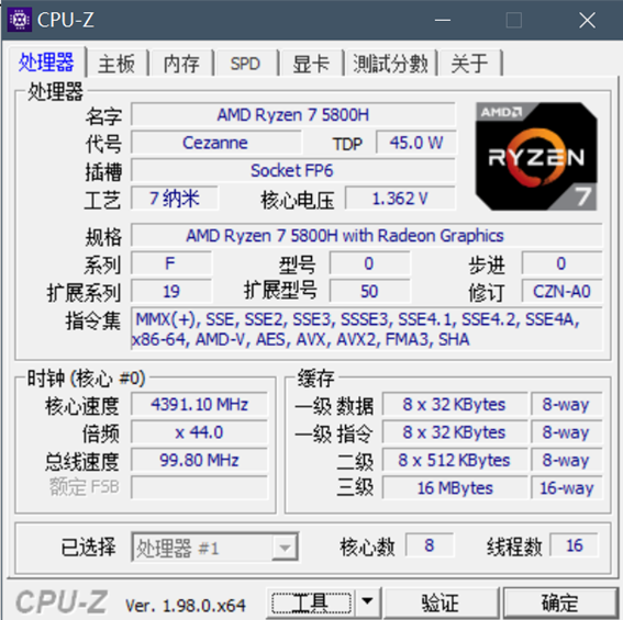 处理器 AMD Ryzen 7 5800H with Radeon Graphics 3.20 GHz