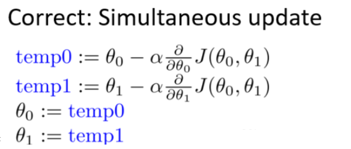 - θ0和θ1应同步更新,否则如果先更新θ0,会使得θ1是根据更新后的θ0去更新的,与正确结果不相符