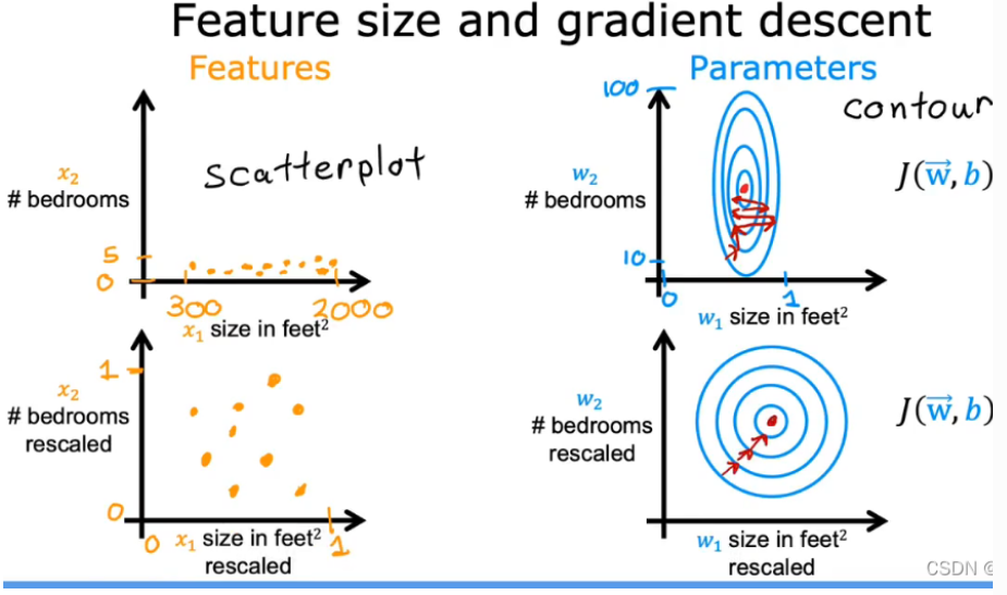 - 为什么要采用特征缩放:在梯度下降过程中对参数的更新可以使每个参数的进展相等